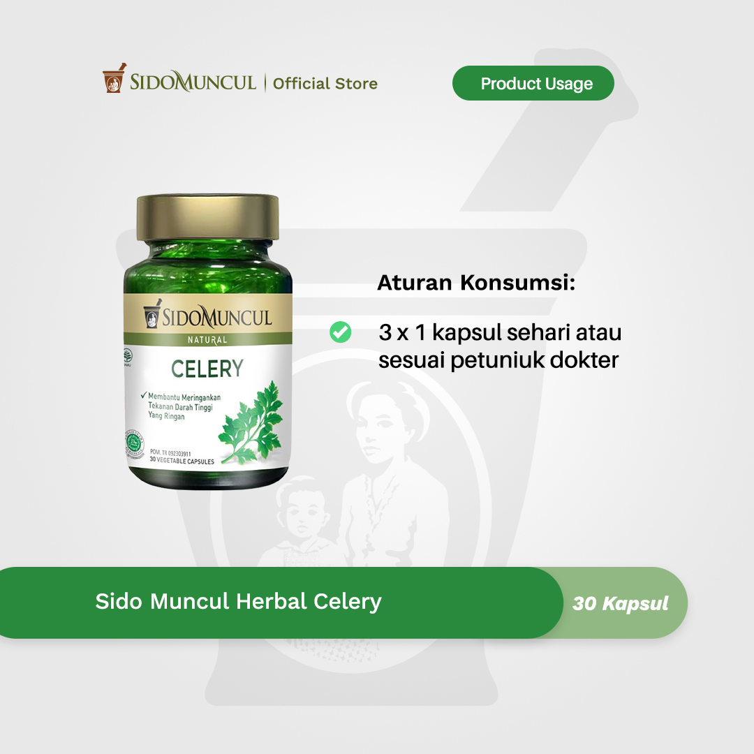 - Sido Muncul Celery is safe and meets the specifications for aflatoxin, metal contamination, and microbial contamination test from the Laboratory of PT Industri Jamu Dan Farmasi Sido Muncul Tbk certified by KAN and ISO 17025